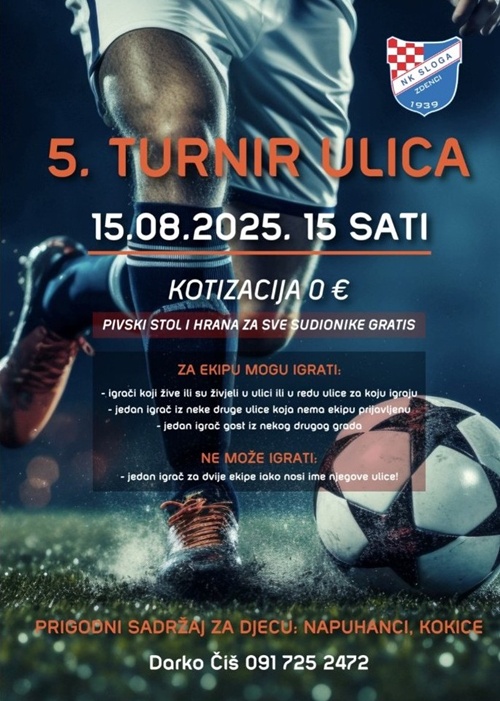 U organizaciji NK Sloga Zdenci po 5. puta bit će odigran malonogometni Turnir ulica. Ove godine turnir je najavljen za 15. kolovoza na blagdan Velike Gospe.