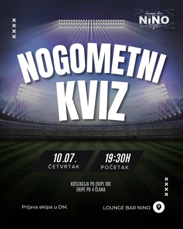 Ovoga četvrtka u Slatini bit će održan Nogometni kviz, koji će biti održan u Lounge Baru Nino. Kotizacija po ekipi, koja čini 4 člana, je 10 eura. Početak je najavljen za 19,30 sati. Prijava se može izvršiti putem poruke na službenoj stranici Bara Nino.