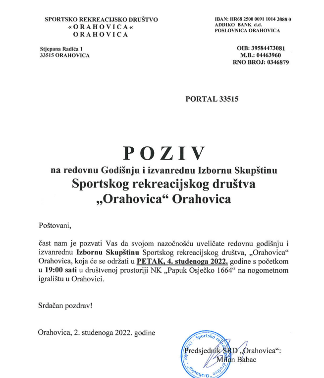 Po pozivu predsjednika Milana Babca, sutra će se u Društvenoj prostoriji NK Papuk, održati redovna godišnja i izvanredna Izborna Skupština Sportskog rekreacijskog društva „Orahovica“. Na sutrašnjoj Skupštini bit će podnesena izvješća o radu Udruge za proteklo jednogodišnje razdoblje, da bi potom bili izabrani i novu ljudi koji će voditi Udrugu u narednom razdoblju. Godišnja Skupština SRD „Orahovica“ počet će sutra u 19,oo sati.