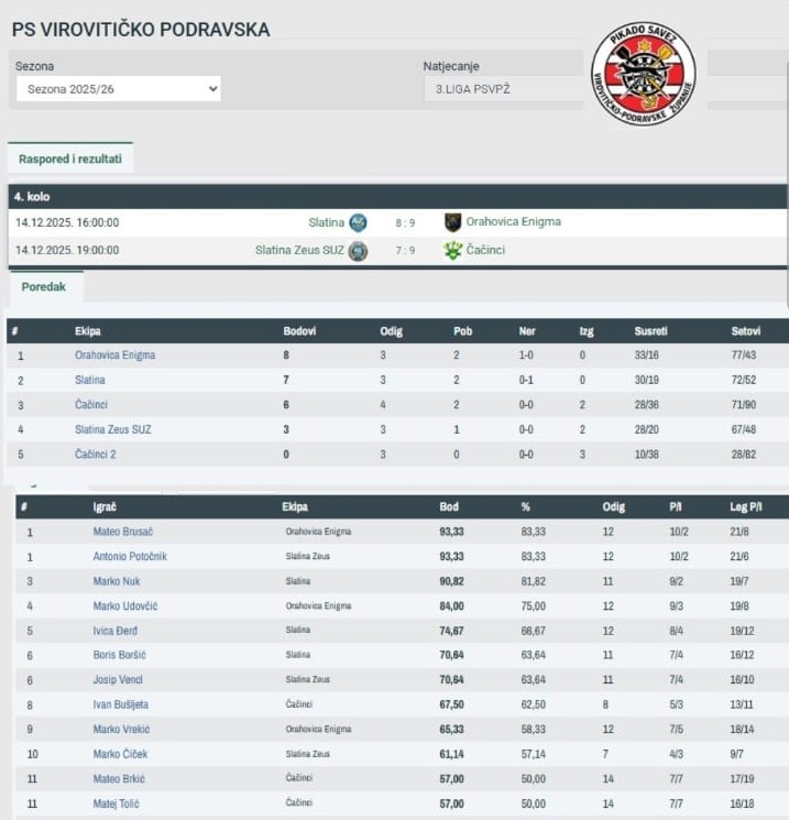 U drugoj utakmici 4. kola Pikado lige PS VPŽ odigranoj u Slatini, ekipa Čačinaca ostvarila je vrijednu gostujuću pobjedu protiv domaće momčadi Slatina Zeus SUZ rezultatom 9:7.