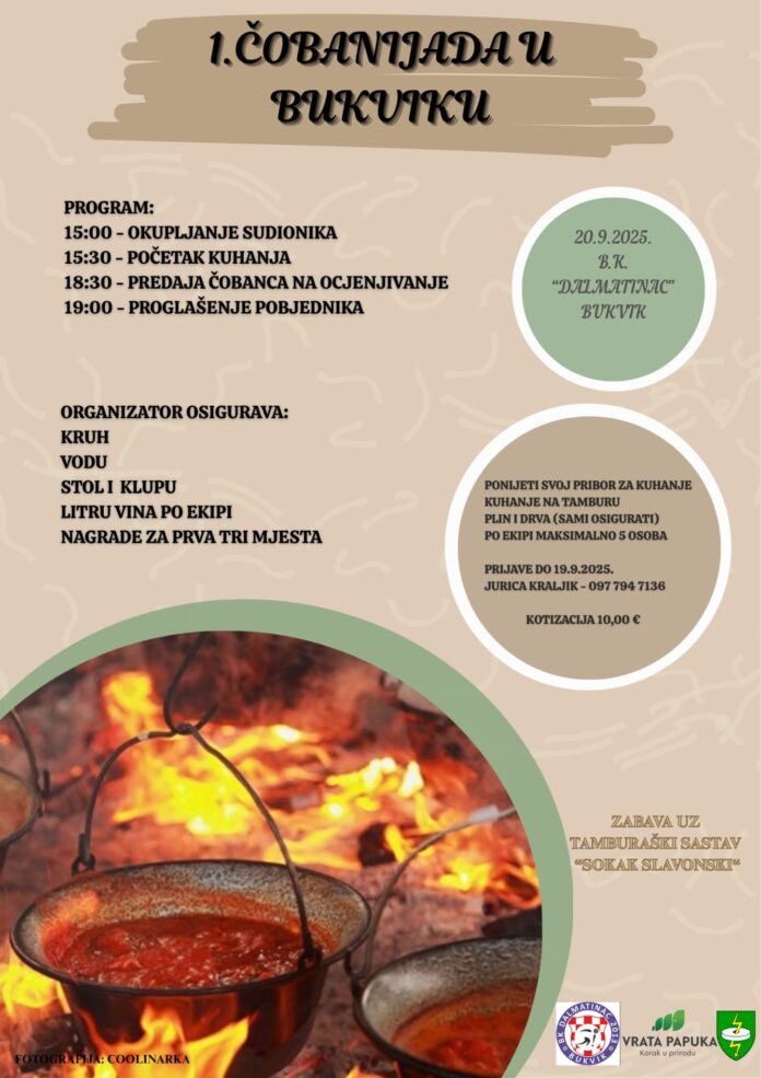 - Nakon uspješne Fišijade, odlučili smo se organizirati i našu prvu Čobanijadu. Mi kao organizatori osiguravamo kruh, vodu, stol i klupe, litru vina po ekipi, te vrijedne nagrade za prva tri mjesta. U domeni kuhara, odnosno ekipe su meso, začini, drva (ako će kuhati na drva), plin, tambura. Prijave primamo do 19. rujna, kotizacija iznosi 10 eura po ekipi, u kojoj smije biti najviše 5 članova. Tijekom poslijepodneva i večeri, sve će zabavljati TS “Sokak Slavonski” – rekao je predsjednik BK Dalmatinac iz Bukvika Jurica Kraljik.