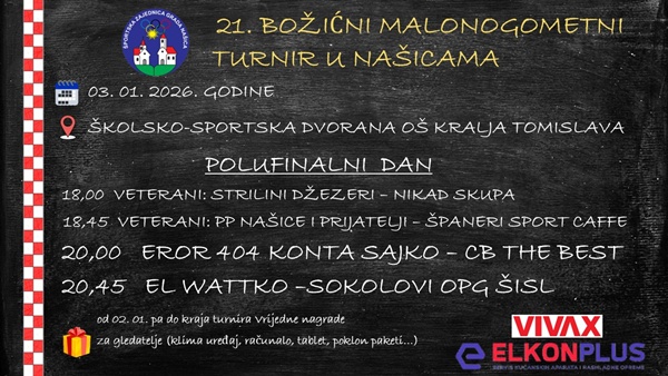 Sutra, 03. siječnja 2026., nastavlja se 21. Malonogometni turnir u Našicama polufinalnim utakmicama. Dan otvaraju veterani u 18:00 sati, a odmah nakon njih slijede polufinala seniora. Tijekom završnih večeri, organizatori su osigurali i bogatu tombolu.