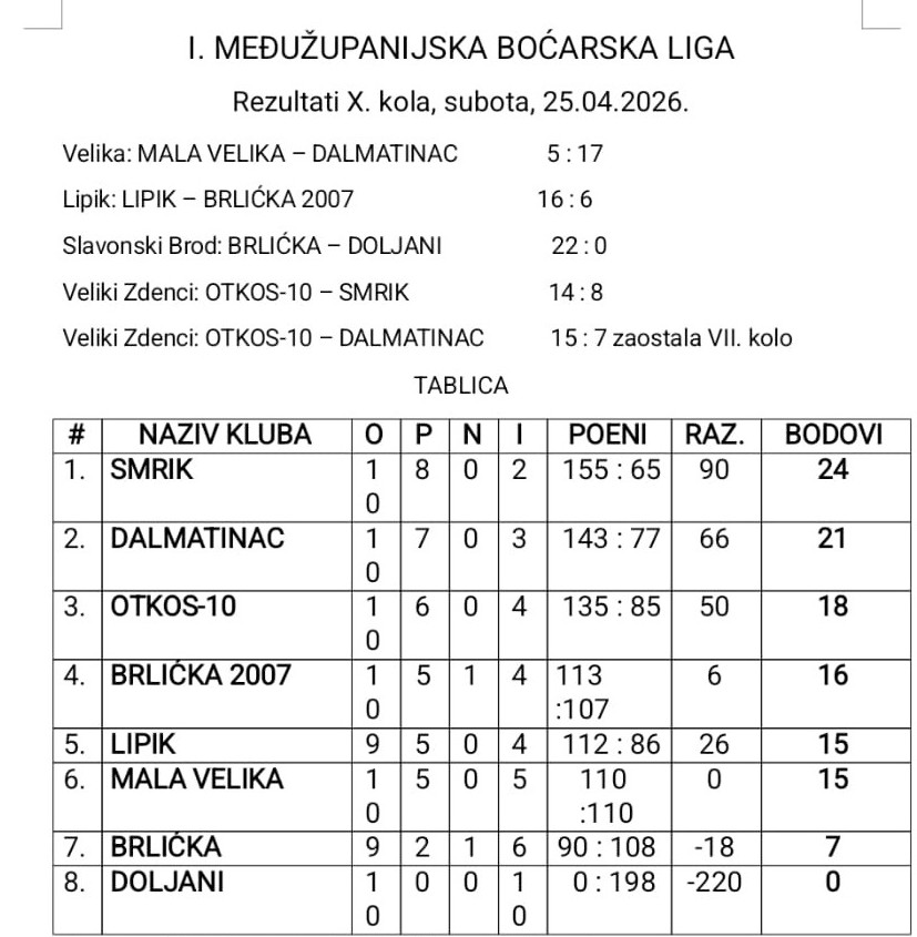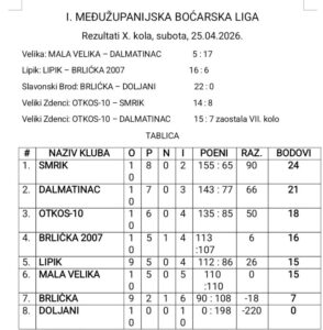 U sklopu 10. kola Međužupanijske boćarske lige, boćari Dalmatinca iz Bukvika vratili su se pobjedama, a nakon poraza u Velikim Zdencima. Na gostovanju u Velikoj, Dalmatinac je odigrao sjajnu utakmicu i uvjerljivo svladao domaću Malu Veliku rezultatom 17:5. Bila je to sigurna i dominantna predstava Bukvičana, koji su kroz kvalitetnu igru i dobar ritam potvrdili povratak u formu te ponovno uhvatili priključak u borbi za vrh ljestvice i naslov prvaka.