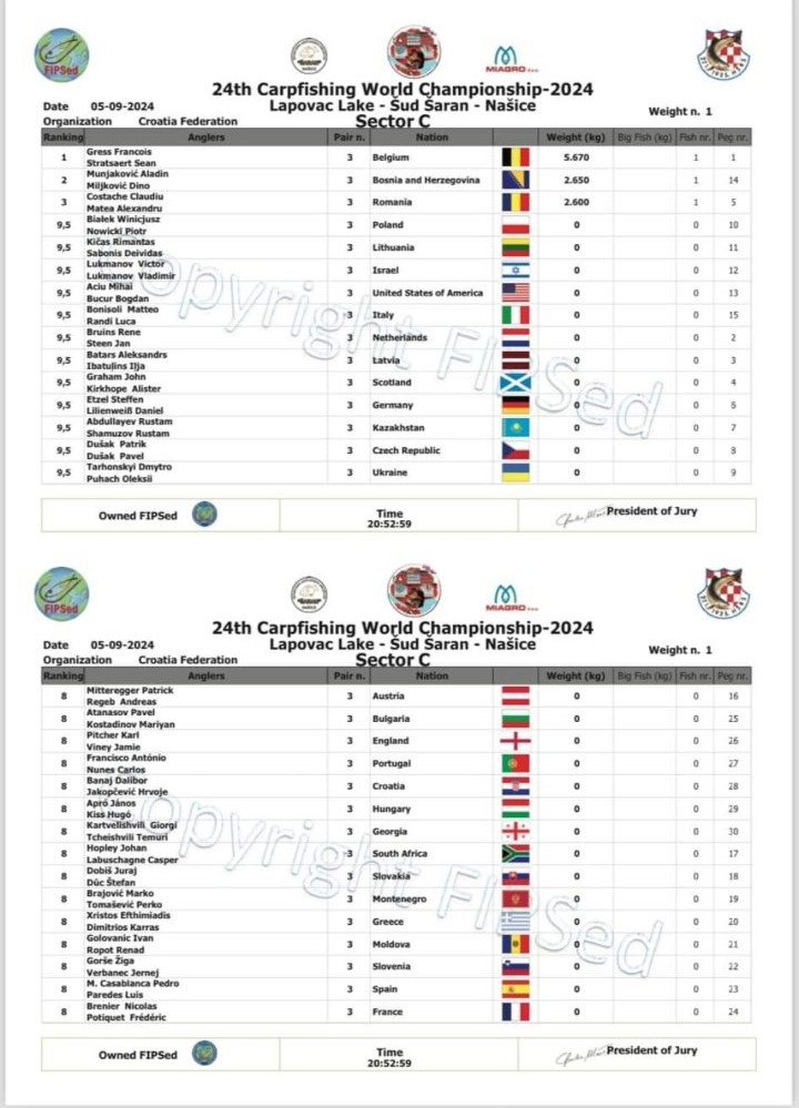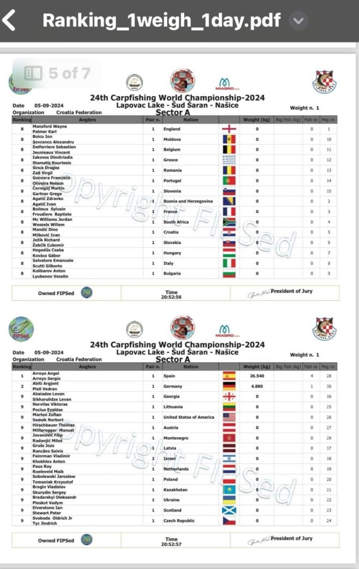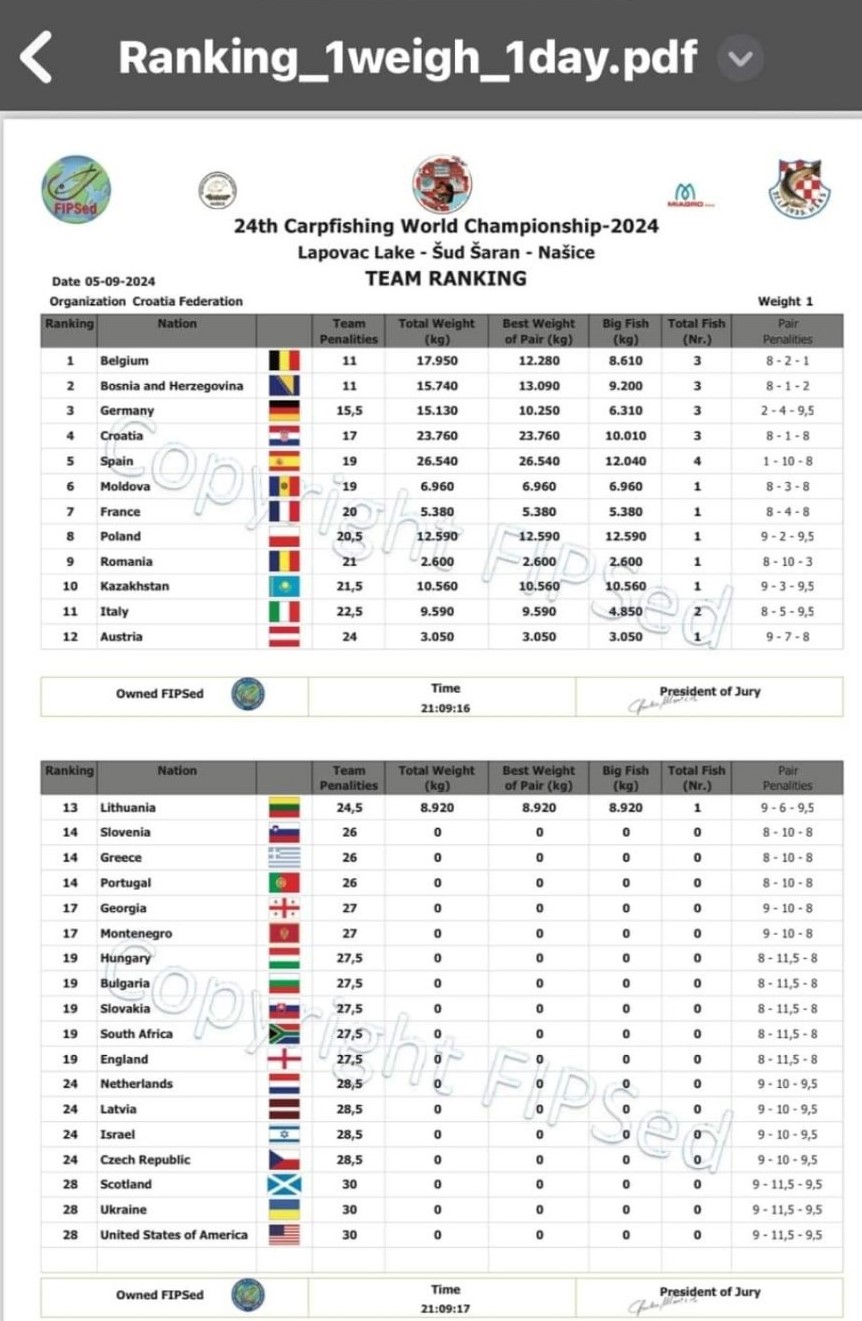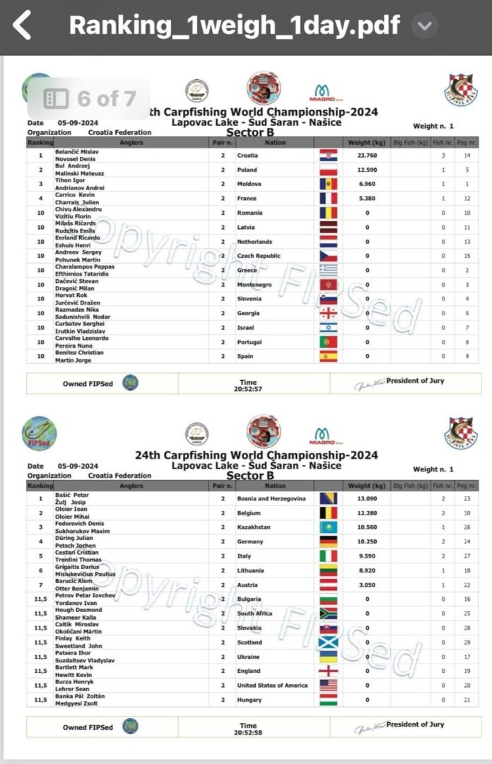 Tamo negdje iza 21,oo sata objavljena je prva službena vaga 24. Svjetskog prvenstva u lovu šarana i amura. Hrvatska reprezentacija u ukupnom poretku zauzima 4. mjesto.
