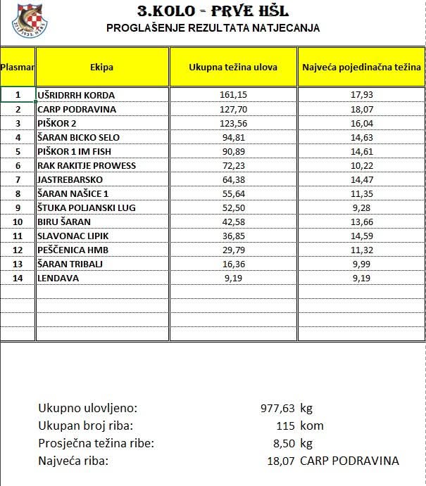 Rezultati ovog trećeg kola u kojem je ulovljen 977.63 kilograma šarana i amura su sljedeći: