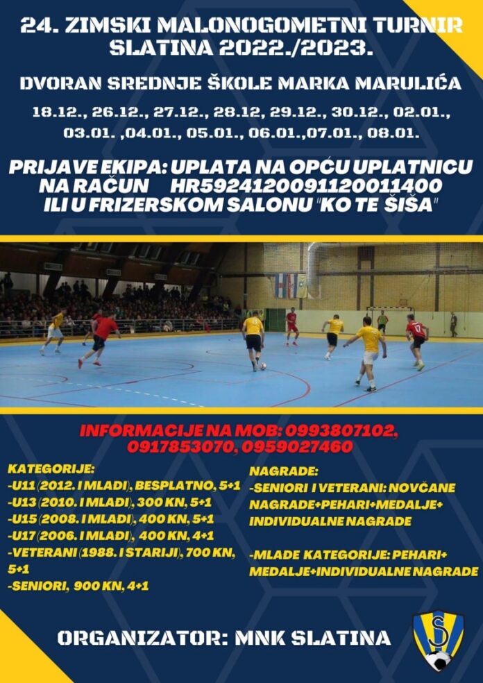 Nakon dvije pandemijske godine, u organizaciji MNK Slatina, ove će se godine u SD Srednje škole Marka Marulića, igrati 24. izdanje Zimskog malonogometnog turnira Slatina 2022./2023. Turnir će se igrati u 6 natjecateljskih kategorija: seniori (900,oo kn kotizacija), veterani 1998. godište i stariji (700,oo kn), U-17 (2006. i mlađi, 400,oo kotizacija), U-15 (2008. i mlađi, 400,oo kuna kotizacija), U-13 (2010. i mlađi, 300,oo kn kotizacija) i U-11 (2012. i mlađi, nema kotizacije). Kategorije U-11, U-13, U-15 i veterani igrat će 5+1 dok će U-17 i seniori igrati 4+1. Prijave ekipa vrše se uplatnicom na račun: HR5924120091120011400 ili u frizerskom salonu „Ko te šiša“ ” (Braće Radića 13, Slatina). Kotizacija uključuje prijavu 10 igrača, a dodatna 2 igrača morat će se izvršiti uplata od 200,oo kuna (po igraču 100,ookn). Seniori će igrati za nagradu od 10.000,oo kn, drugo mjesto „vrijedi“ 5.000,oo, a treće 2.500,oo kuna. Veterani će se „potući“ za prvu nagradu od 5.000,oo kn, drugoplasirani će inkasirati 2.000,oo, a trećeplasirani 1.000,oo kuna. Sve kategorije bit će nagrađene peharima i medaljama te individualnim nagradama.